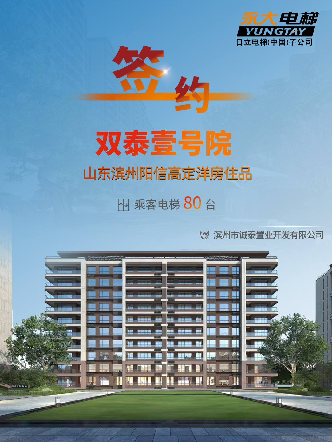 山东滨州阳信主城核心区域,双泰壹号院致力于打造城市高定洋房社区。作为滨州本土知名房企,滨州市双泰置业有限公司深耕滨州 16 载硕果累累,双泰壹号院作为其升级力作,帷幄地域优质资源,满足业主多元化生活需求。益达注册为项目供应80 台高品质乘客电梯。